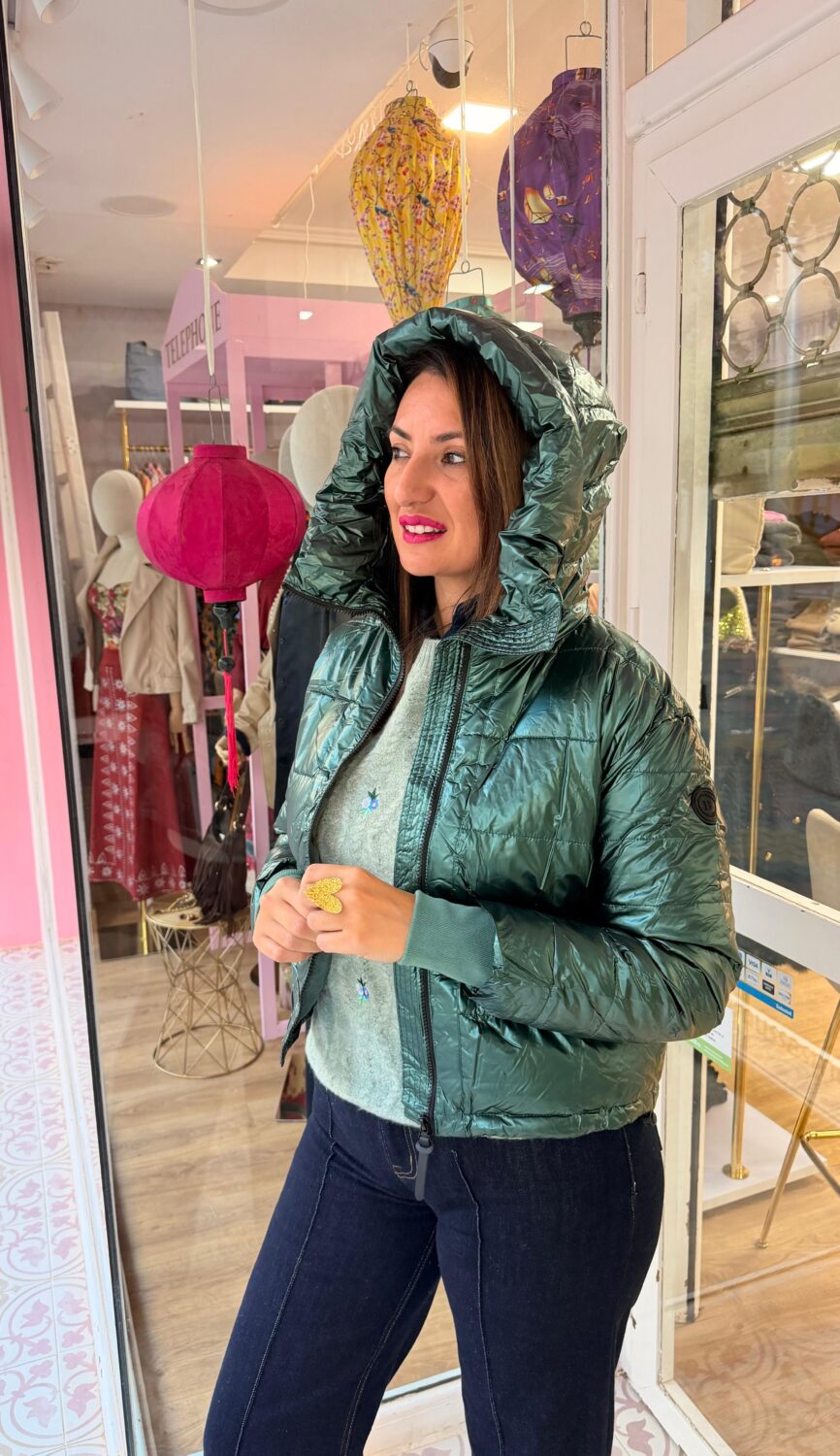 chaqueta acolchada corta para mujer destaca por su llamativo acabado verde metalizado y brillante. Con un diseño moderno y a la última, esta prenda estilo puffer es ideal para añadir un toque de tendencia y sofisticación a cualquier look de invierno u otoño.